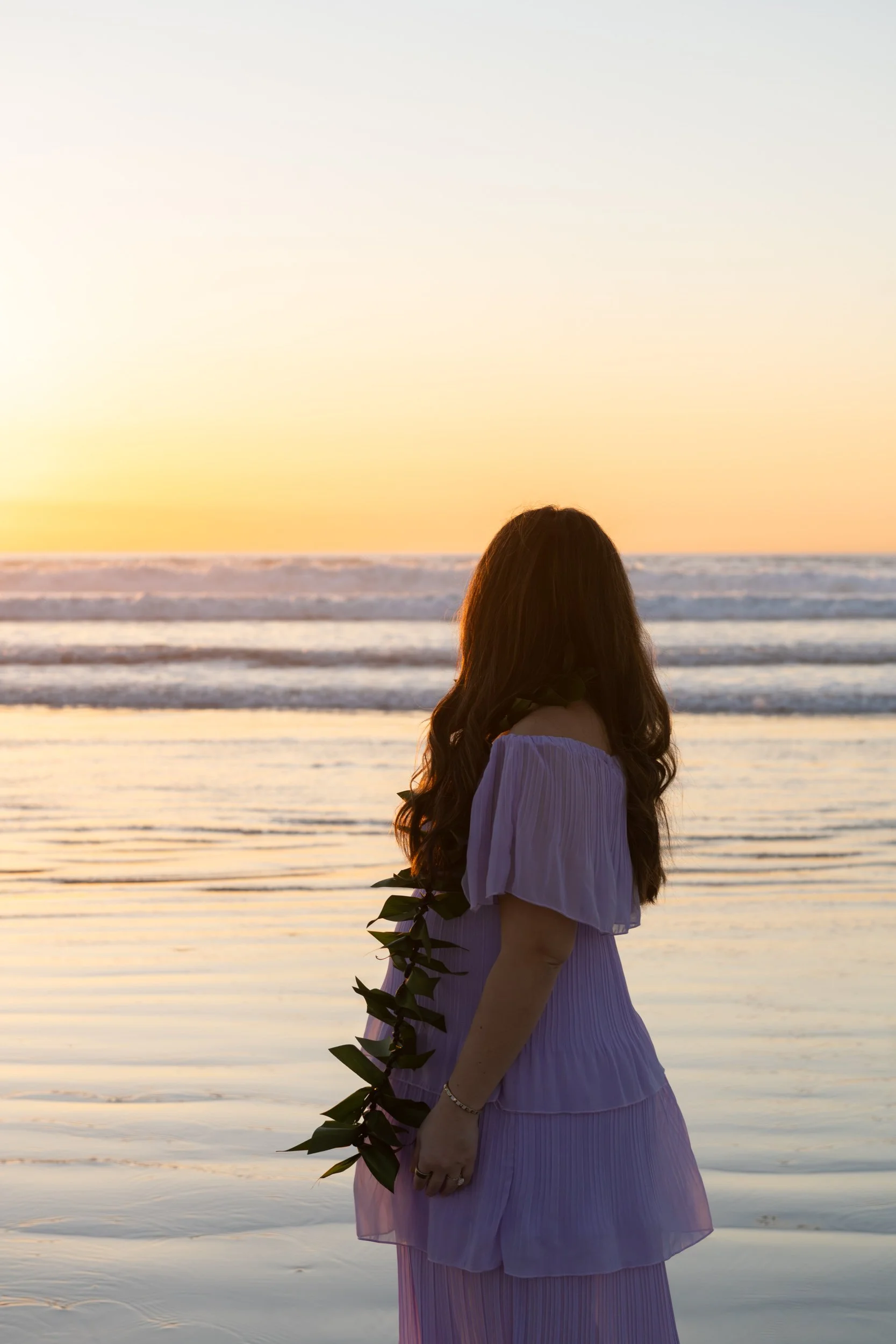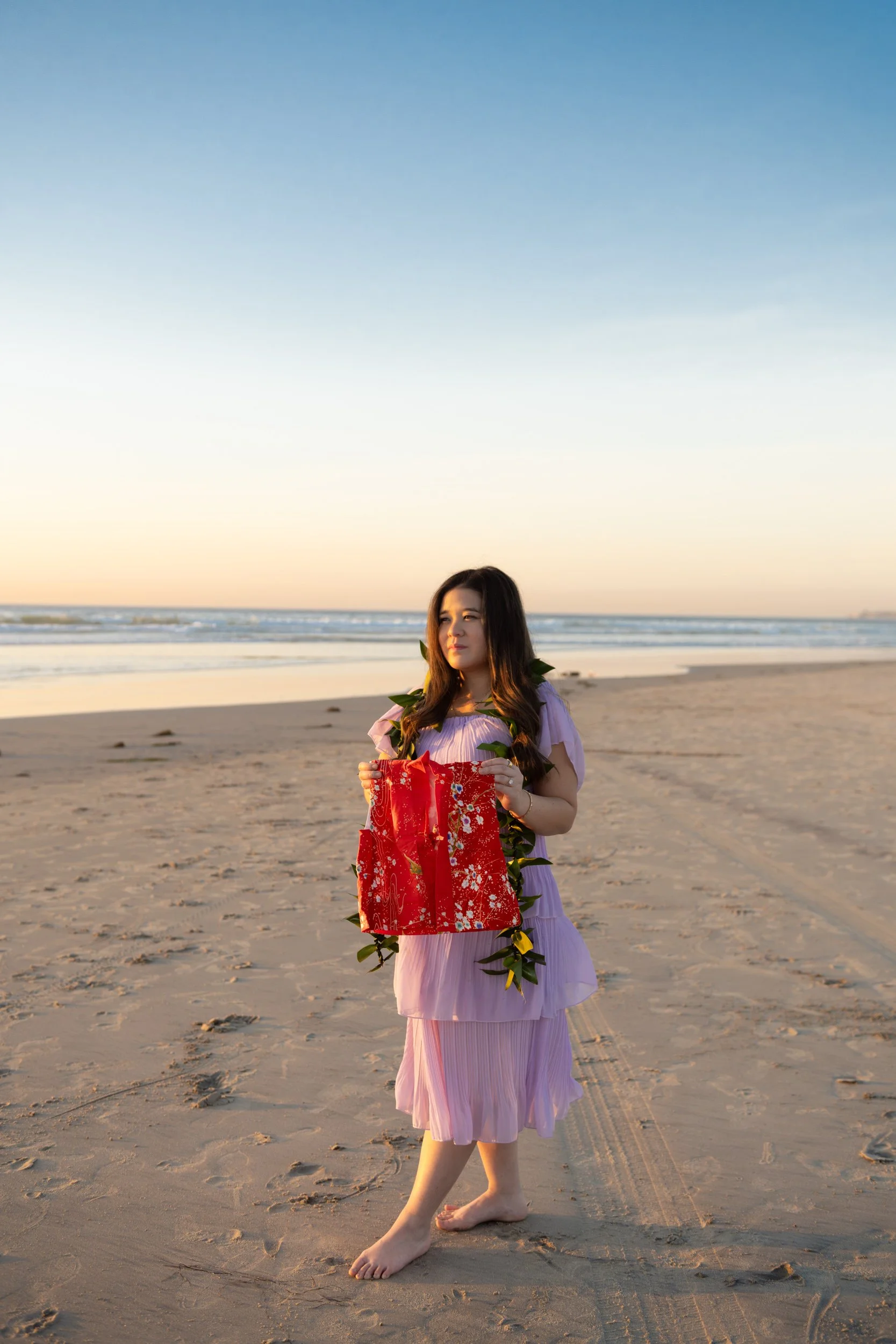 Photographed at the edge of the Pacific Ocean, the water becomes both boundary and bridge. From this shore, the next land encountered is Hawaiʻi, situating her lineage within an island experience shaped by movement, crossing, and the pull between home and elsewhere, offering a feeling of home expansive enough to hold all of who she is.